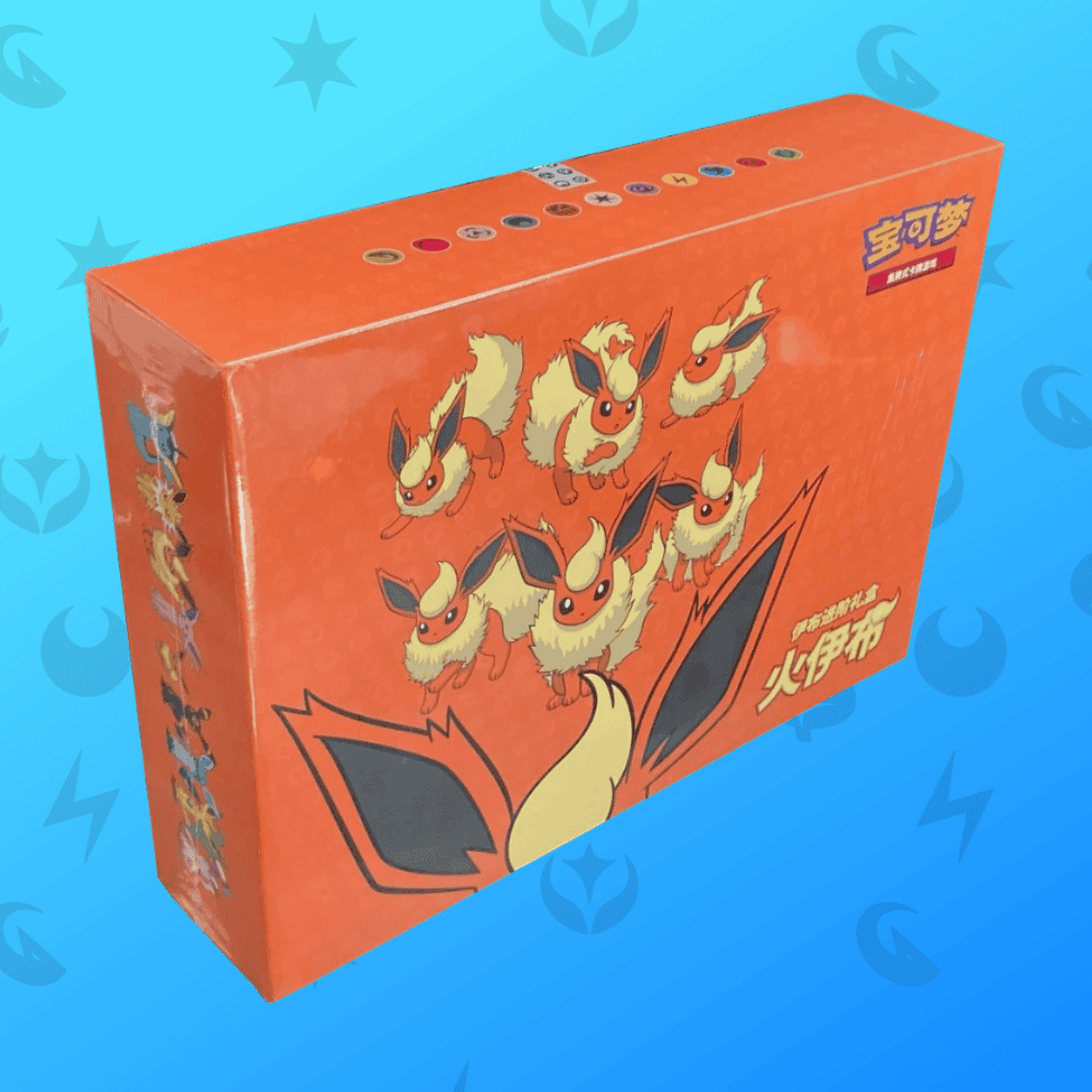Die Flareon VMAX Gift Box aus der chinesischen Nine Colors Gathering & Final Flame Dance-Reihe wurde im Frühjahr 2023 exklusiv in Festlandchina veröffentlicht und richtet sich an Sammler, die Wert auf stilvolles Design, exklusive Promos und thematisch abgestimmtes Zubehör legen. Gedruckt in Japan und veredelt mit edlen Illustrationen, bietet sie ein vollwertiges Premium-Erlebnis rund um Flareon.